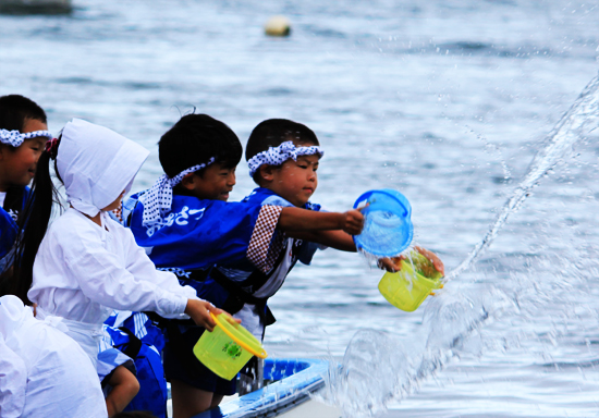 ちびっ子海女、漁士たちが稚魚を放流する