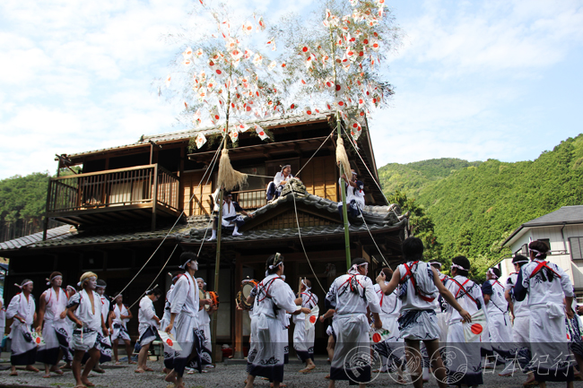 鳥羽市から車で約2時間かけて、朝7時前に南伊勢町方座浦へ着いた。集会場では男たちが酒を飲みながら顔に化粧をしている。7時過ぎ、竹で作ったそれぞれ高さ9mの大幣、小幣を数人で持って町中を回り始める。その後ろに一列に並んで小太鼓を鳴らし、道中歌を歌いながら踊り出た。午前中に三箇所で行われる幣立ての行事がある。一つは選ばれた家、次は新築の家、最後は漁港広場で2本の幣を立て、小太鼓を鳴らしながら踊る。真夏の暑さで太鼓の音が町内に響き、汗まみれの踊りは見る側も大変な思うがする。11時30分頃に午前中の行事が終了し、残りは午後から浅間山へ登ることだ。