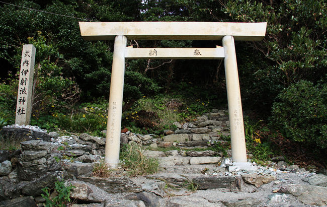 安楽島町の産土神、満留山神社から歩いて約30分。途中に小道が続き、海岸沿いには海に向かって鳥居が立っている。鳥居をくぐると急な石階段があり、頂上に伊射波神社が待ち受ける。