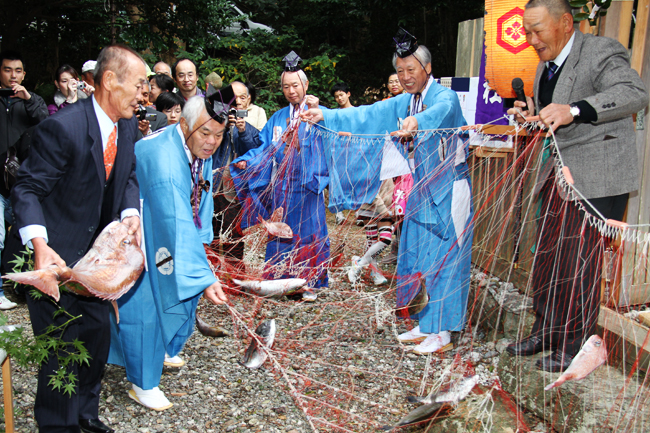 祭神は稚日女尊以外に伊佐波登美尊、玉柱屋姫命、狭依姫命の四柱があり、縁結びや海上守護の神として知られる。11月23日は勤労感謝の日で、日本は古くから神々に五穀の収穫を祝う風習があり、飛鳥時代から新嘗祭の形で伝えられてきた。鳥羽は海の国として大漁を祝う祈願祭が多く、この日に伊射波神社で例大祭の大漁祈願祭、御魚取(みとと)り神事があった。