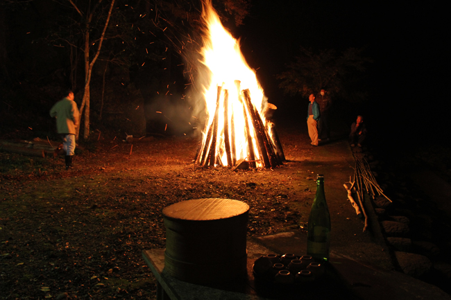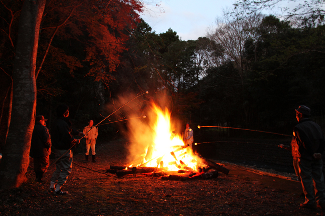 今年夏ごろに初めて南伊勢町斎田へいった。斎田には山の神が鎮座し、横には斎田川が流れている。斎田の山の神さん祭礼は毎年12月8日に近い日曜日と決まっていて、早朝の5時ごろから行われると地元の方から聞いた。12月4日(日曜)の朝、斎田の山の神さん祭礼を見ようと5時頃に斎田へ着いた。周りは真っ暗で人影もない。5時20分ごろ、地元の人々が徐々に集まり、斎田川沿いにある山の神の祠にお参りし、前日に用意された松明に火をつけた。地元参拝者には餅やお神酒が渡され、長さ5mほどの笹竹先端に餅を刺してどんど火で焼く。私にも2個渡され、焚火で焼いて美味しく頂いた。
