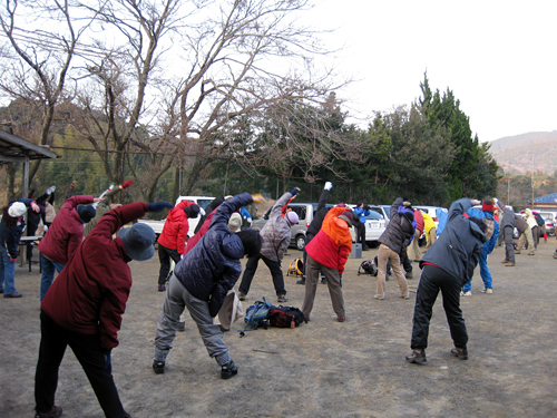 | 出発を前に準備体操 | 切原峠で五ヶ所湾を眺める | クッションある落葉の道 | 記念撮影 |