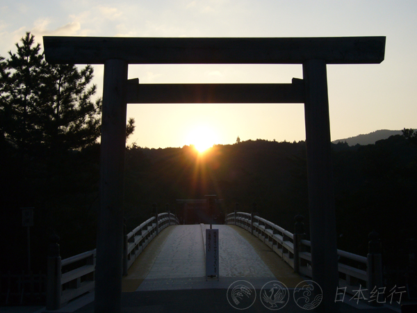 伊势神宫于一千多年以前搭建在依山傍水的伊势湾沿岸,这里是俯瞰东方的门户。夏至期间因朝拜日出而知名的夫妇岩是伊势神宫的第一道门。古时候,日本人去伊势神宫参拜首先去伊势市二见浦的夫妇岩,在海水中净身洗礼之后参拜掌管丰衣足食的伊势神宫的外宫,最后才到伊势神宫的内宫参拜日本天皇家族的祖先神-天照大御神,也就是太阳神。