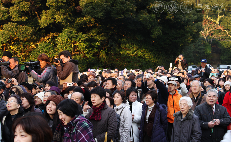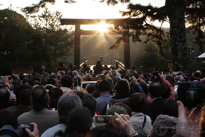 伊势神宫的大鸟居朝西而立,走进鸟居是一座木制拱桥叫宇治桥。冬至这天的日出正好是从宇治桥和大鸟居的正中间升起。因为朝东的方向横亘着神路山,所以太阳升起的时间通常要比正常的时刻推迟50分钟左右。三年前(2008年),我第一次观看了伊势神宫的冬至祭。虽然赶在阴天,可是来朝拜的人并不少。我没有看到日出却遇见许多闭目合掌的人久久地站在伊势神宫的鸟居前。今天(12月22日),我又来到了伊势神宫。鸟居前早已站满了朝拜日出的游客和一些摄影爱好者。人们摩肩接踵,在严寒之中翘首期盼着冬至的日出。早晨7点40分,耀眼的光环透过神路山的茂密森林从鸟居之间照射进来。此时,大家不约而同地惊叹和欢呼起来。伴随着相机有节奏的卡擦卡擦声,那是个奇妙的瞬间。看着冬至的曙光分毫不差地从宇治桥和大鸟居的中央冉冉升起,仿佛这座桥和鸟居就是为了冬至朝拜而设计的。