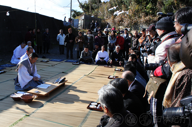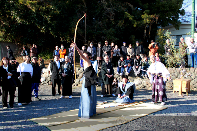 盘中鱼神事之后,紧接着就是射箭仪式。由两名初中生分别将箭射向大靶(方型)和小靶(圆形)各三次,最后一箭是射向大海的。在日本,射箭有破魔的含义,所以新年开始的时候在一些沿海的部落常能看到射箭等传统民俗。射与切虽然动作不同,可是驱邪免灾的内含从古至今都没有改变过。