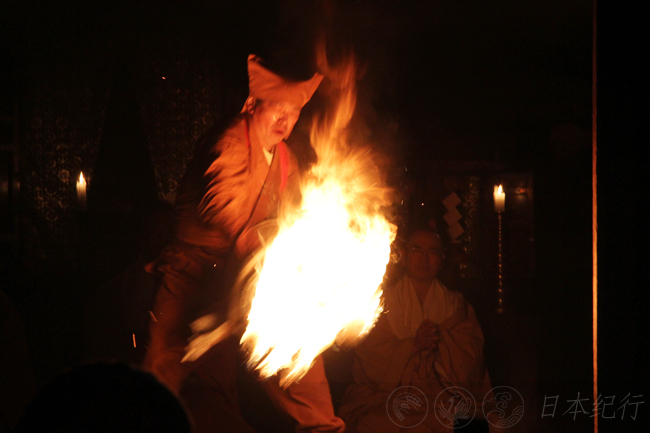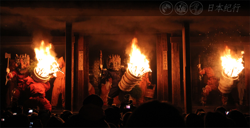 为了观看奈良的鬼走火节,我开着夜车于晚上8点多赶到了山路崎岖的五条市大津町。此时吉野川河畔的念佛寺里已经挤满了围观的人群。天很冷,透过依稀的篝火可以看到念佛寺草庵上覆盖的白雪。九点整,钟声、鼓声和棒打之声响彻了黑暗的山谷,火的祭典开始了。首先由掌管火种的火天(印度神话中的火神)托起巨大的松明火走到堂前。当他用燃烧的松明在空中画着‘水’字时,火焰纷飞,围观的群众连连叫好。火天画过3遍‘水’字之后,就轮到父鬼、母鬼和子鬼的登场。只见父鬼右手举着斧头,左手和膝盖拖着60公斤重的松明火,仿佛就是不动明王的化身。堂前三鬼并立,好不威风,这也是鬼走火节的最佳看点。据传,当地人们有根据父鬼、母鬼、子鬼的松明火势来预测这一年的早稻、中稻和晚稻收成的民俗信仰。在我看来,今年的父鬼火势最旺,应该是早稻丰年吧。