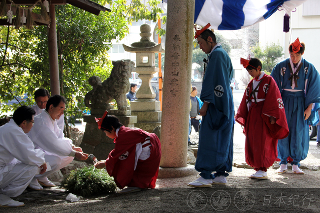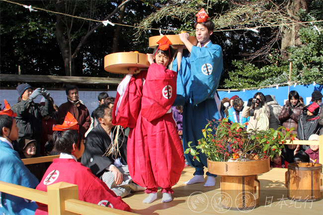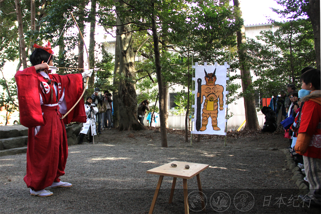 楠部町的氏神供奉在五十铃川河畔的櫲樟尾神社里。1月16日下午,平日里静悄悄的神社前挤满了当地的村民。万岁乐对他们来说是一年当中最盛大的祭典。开始是由当地的孩子们将两架饰有凤凰图案的神舆抬进櫲樟尾神社,然后是射鬼仪式。身穿猎装的三个大人和三个小孩儿分别将箭射向鬼靶子上,每当射中鬼身,人们就会鼓掌欢呼。当射鬼仪式结束的时候,孩子们纷纷上前撕破鬼靶子上的纸片,仿佛是争夺战利品一样。最后,由一大一小的三组射手分别将祭坛上盛着吉祥之物的木桶扛在肩上,绕场三周,还不停地念叨着“早稻丰收,萬歲楽;中稻丰收,萬歲楽;晚稻丰收,萬歲楽。”围观的群众们也随声附和着﹕萬-歲-楽。这就是当地的村民们几百年传承下来的丰年舞。稻作文化需要协作的精神,当地人们一直认为,只有让土地庙里的氏神欢心,人们才能更好地过活。