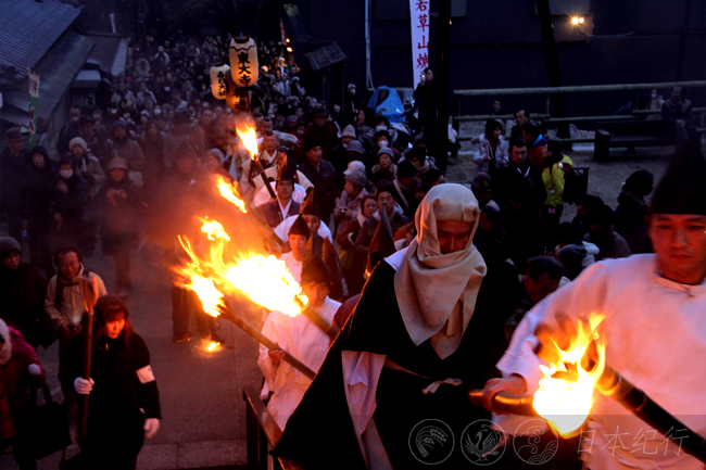 下午5点,由东大寺、兴福寺和春日大社的僧侣、神职人员等组成的45名圣火队从奈良公园的丝绸之路交流馆出发,在螺号声中庄严肃穆地迈向若草山麓的野上神社。山口处是点燃松明火的地方,在靠近纵深的山涧之前有一席小小的缝隙,我夹杂在人群中观看到点燃圣火的全过程。夕阳将最后一抹余辉留给大地的时候,松明火队登上了野上神社。火光中祈祷声﹑诵经声不绝于耳,山坡上数以万计的人们正等待着烧山的一幕。