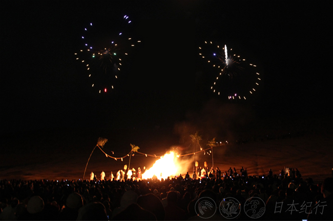 晚上6点,腾空而起的焰火拉开了火烧若草山的序幕。在音乐的伴奏下,600支焰火在奈良的夜空中上演着扑朔迷离的华彩。旁边的孩子们用清脆的嗓音从焰火中分辨着向日葵、兔子、鹿…等山野中生息的动植物的图案。接下来由300人组成的消防队员将手中的火把一齐点向了若草山。火光霎时间腾空而起,扑卷着热浪向上蔓延。