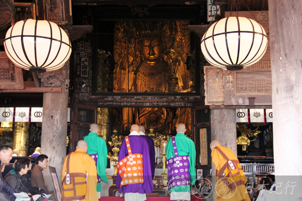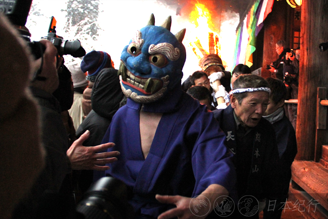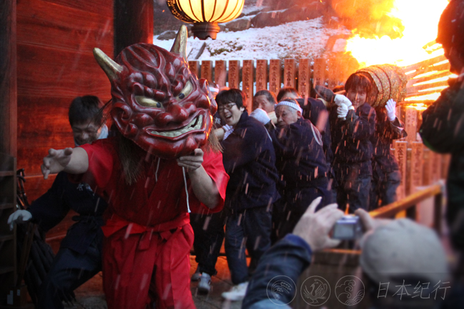 长谷寺的主佛是1538年做成的金色十一面观世音菩萨像。下午3点在正殿前通过了一系列祈祷国泰民安的忏悔法事后,随着海螺和太鼓的信号声,便由赤、青、绿三色装扮并代表着人间三种罪恶的三个恶鬼出现在众人的面前。他们在120公斤重的巨大松明火炬的追赶下发着奇异的怪叫声在人群中肆意妄行。到最后还是在佛法的威力下被驱赶的无影无踪。
