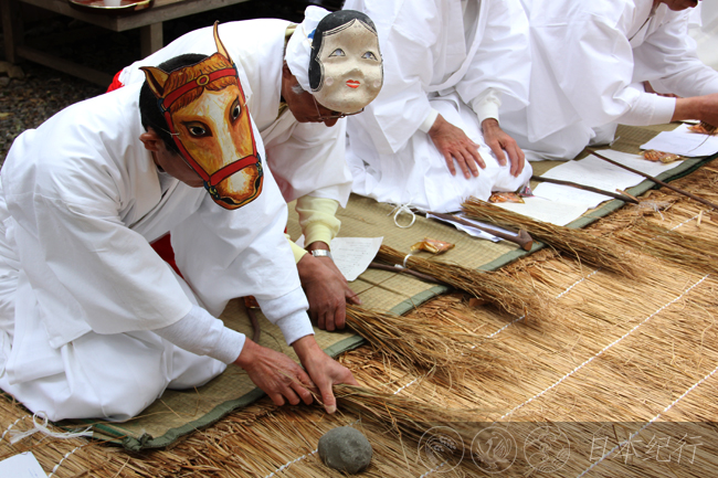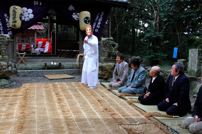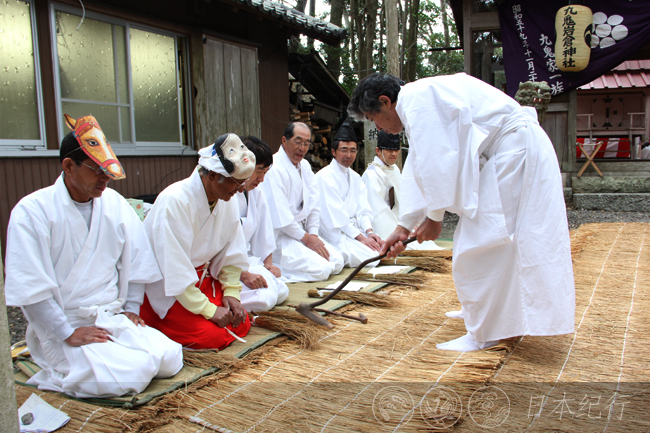锄形祭是鸟羽市九鬼岩仓神社春季的一次活动,原风景诙谐幽默。这天从清晨就下着小雨,可是在日本有关农耕的礼仪不管刮风下雨都会如期举行。九鬼岩仓神社的社殿前铺着一张草席,它表示将要开垦的土地。草席左侧白衣装扮的七个男人是锄形祭的表演者,右侧则是嘉宾席。席间每个人的面前都摆放着用树枝削成的小锄头和稻草。农歌齐唱时,分工明确的农耕仪式便开始了。首先是用小木锄整地,然后是打垄、施肥、播种、最后是插秧。看着他们风趣的表演,不清楚的还真让人怀疑这些上了岁数的男人们在忙些什么?!