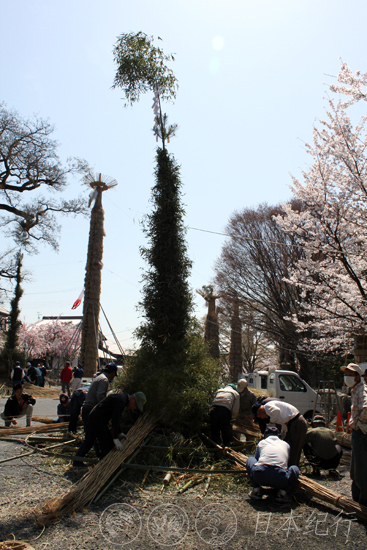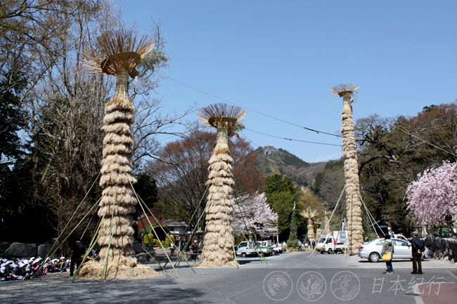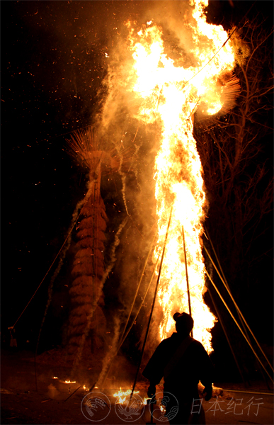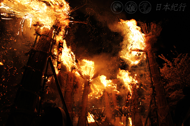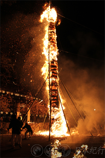 中午十分,在近江八幡市的日牟礼八幡宫的鸟居前我看到了形状各异的巨型火把矗立在宽敞的大院内。这些大小不一的火把都是由周边十二个乡的居民编制而成的。当天夜里这里有30多个火把将被点燃,到时十二个乡之间会互相竞争火焰燃烧的大小、形状及哪个乡能更好地控制住熊熊燃烧的火把直到它烧尽为止,所以每个乡在编制火把时可以说是绞尽脑汁下了一番苦心。