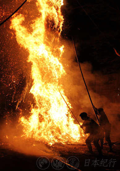 | 众人合力用竹竿支起点燃的火把 | 滋贺县八幡火祭 | 用竹棍敲打烈火 |