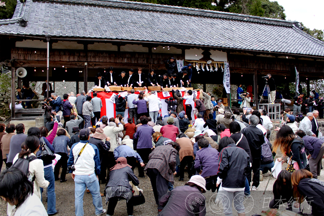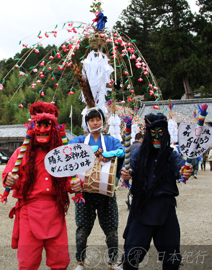 至今为止我看过两次鞨鼓舞。第一次是去年8月在同县的伊势市,第二次便是这回在伊贺市的阳夫多神社里。虽说二者同属三重县,可在舞蹈的形式和意义上却截然不同。前者是在每年7、8月份的盂兰盆节期间为了超度亡灵举行的念佛舞。后者则是祈愿风调雨顺或是庆祝农业丰收,多在每年4月和10月举办的农事舞蹈。不论哪一类形式的舞蹈都生动地再现了当地村民对美好生活的执着信念。虽然距离上次看鞨鼓舞已过去将近一年了,可是留在脑海中的印象却依然深刻。直觉告诉我,这种舞蹈本不该存在于这个世纪,可是它就那么不可思议地存在着。