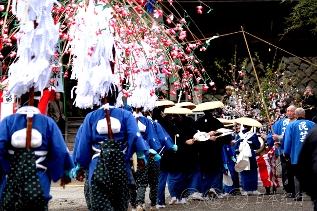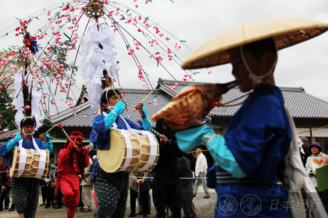 今天,我来到了三重县西北部的伊贺市。它是江户时代俳圣松尾芭蕉的出生地,更以忍者之乡在日本广为人知。伊贺市阳夫多神社的鞨鼓舞起源于江户时代,舞者腰系鞨鼓,头戴用山鸡羽毛做成的头冠,身后则背着一个用竹子编成的类似花篮的饰物,而且在每根弯曲下垂的竹竿上还扎着用红白色纸制成的樱花。当舞者随着节拍旋转时,竹竿和那上面的纸花自然弹起,犹如漫天飞舞的樱花一样。