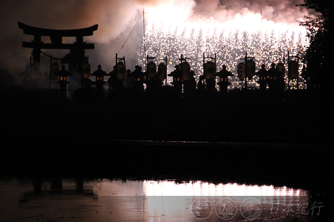 晚上七点,鼓、钲、爆竹之声在静夜中响起,由当地男人组成的太鼓队和孩子们拉着镶有凤凰图案的神舆行走在村落间。神舆队伍每到一户门前,屋中关着的灯火就会被点燃,看来这就是当地家家户户的迎神仪式吧!大约八点左右,神舆回到了小日吉神社,弓削火祭便开始了。在神社的院内人们用焰火点燃了几束一米多高的火把,与此同时神社的外面似瀑布般的焰火在漆黑的夜里不停地燃烧着。当焰火停息后,矗立在田边的两个巨大火把(大松明)才被点燃。伴着噼啪的声响,火焰向周围释放着巨大的能量,直到柱型火把朝着倒三角型火把的方向倒下去,绚烂多彩的弓削火祭才算结束。