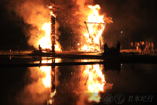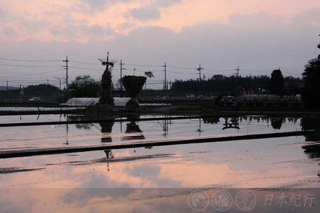 天已是黄昏,我在小日吉神社的周边转了转。这里除了田里的蛙声和两三个孩子在附近的空地上踢着足球,整个村落都静悄悄的。位于神社东南方的两个大火把显得异常醒目,据当地人说,顶端犹如伞状的柱型火把代表男人,另一个倒三角型的则代表女人。