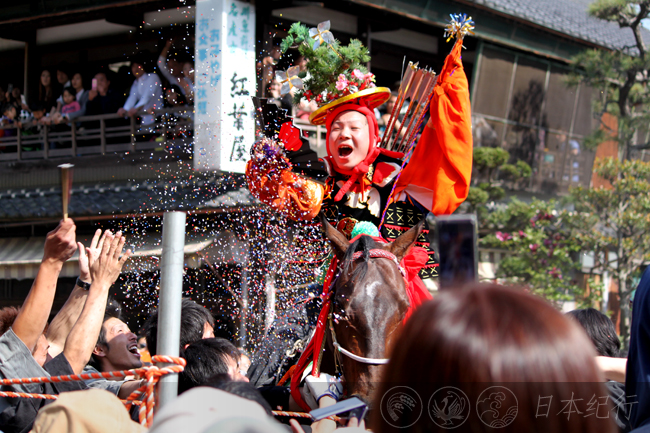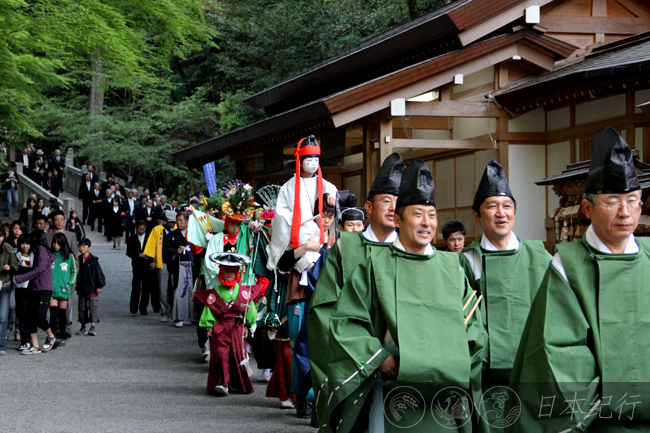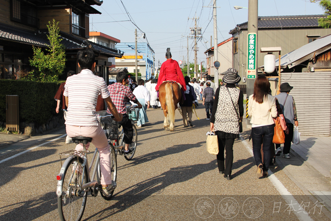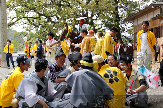 今年4月2日,我在附近的猪名部神社里第一次观看了勇壮的上马神事,相比之下多度大社的上马神事多了一些风趣的场面。多度大社里除了旗手之外还有六名化妆怪异的醉汉(酒乱)在场上烘托气氛,上马结束之后还有一连串的游街、射箭,听当地人说不闹到夜深是不会结束的。