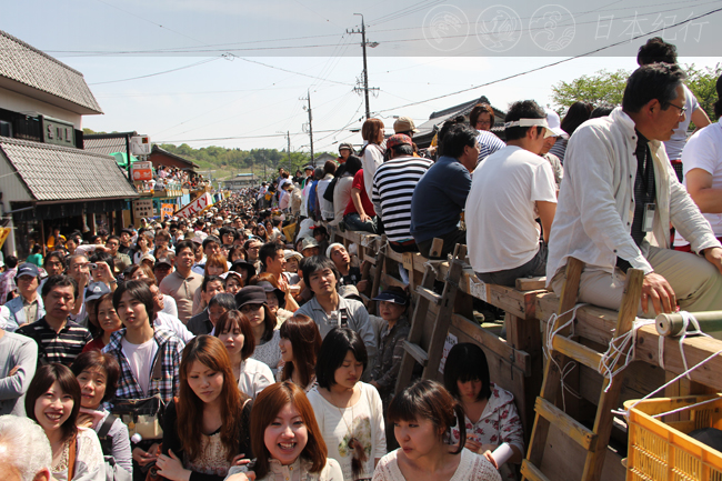 多度大社的上马神事从5月4日到5日共举行两天。5月5日正值日本的男孩节,上马神事和鲤鱼跳龙门有没有关系我不太知晓,但是多度大社里的白马被视作神的使者,并从马的神色举止中预测农作的丰欠却是这里的传统习俗。今天有两匹马顺利越过高墙,几万名看客的欢呼声犹如潮水般地一波盖过一波,看来人马一体的上马神事已牢牢地牵动着上万人的心弦。