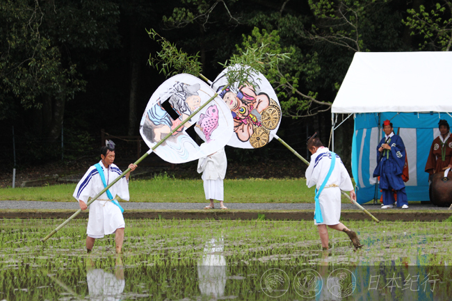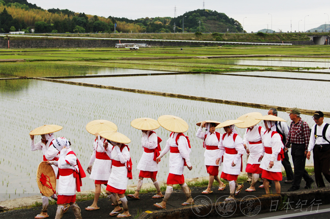 5月7日上午,当我来到神田时,田里已经灌满了水,身穿传统服饰的30多名男女抬着锣鼓和大团扇远远地走在稻田间。下田的男人们露着小腿,女人头上围着方巾戴着蓑帽。田里的水是泥色的,却清晰地映出他们那一身光鲜洁净的插秧服。一行人来到铺着白石的祭场,祭坛上摆放着三把稻苗,当神职人员匍匐祈祷时,其他人也跟着行跪拜礼,时代好像推溯到几百年以前。