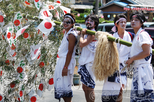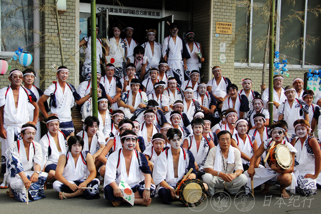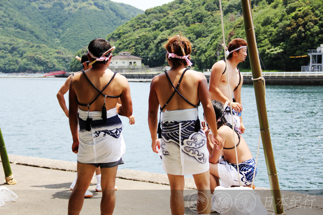 当天清晨,我从鸟羽大约花了2个小时才赶到交错于山海之间只有二百户人家的方座浦渔村。早晨7点,当我走进村里的集会场时,几十名男人正在那里饮酒聊天,脸上涂抹着各种颜色的涂料。据村里的人说,方座浦的浅间山(当地最高的山)上供奉着姊妹神。姐姐长得丑陋,妹妹则是美女。男人们化妆是为了博得山神(女神)的欢心。彩妆结束后,人们抬着9米高的两支姊妹竹(代表神轿)在村子里绕来绕去,化了妆的男人们载歌载舞,整个渔村都沉浸在节日的喜庆之中。