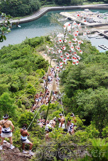 中午休息时,听当地的元老说:“下午的爬山奉竹仪式会更辛苦,陡峭的浅间山上没有阶梯,一不小心就会摔得头破血流。”这里的浅间山其实并不高,可是奉竹的人们却花了将近两个钟头才爬上山顶,其中还有人挂了彩。当姊妹竹被绑在两处规定的山头上时,当地的男人们开始围绕着山顶的庙宇不停地念叨着佛经,这是一种神佛习合的体现。