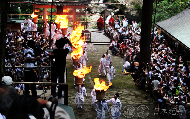 7月的日本天气炎热,今天的那智山比平时更加热闹。山上的熊野那智大社里朱红色的12个大扇轿被排立在院中,它的前面则是12把重50公斤的大火炬。火祭之前,从上午10点在熊野那智大社里会表演大和舞、那智田乐(日本国家重要无形文化财产)。可是万众期待的还是下午2点在那智瀑布前举行的火祭。当3对引火用的小火炬登上神社台阶时那智火祭便开始了。身穿白色服装的人们分成两组,山上的一组高举12个大扇轿往下,山下的则抬着12把大火炬排成一列沿着陡峭的台阶向上走来。中途扇轿和火把相遇,炙热的火焰在众人的面前跃动飞舞。火把在石阶上下画着圆形迂回着,并与飞流直下的那智瀑布形成鲜明的对照。几分钟后,扇轿紧随着火把走下台阶并立在那智瀑布前,水与火的祭典圆满结束。