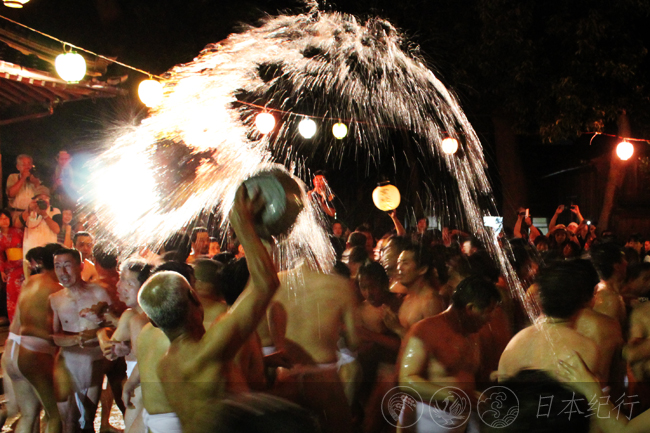 当天晚上八点,以烟花为信号,身上只裹着红、白兜裆布的上百名裸男冲进了人头攒动的八云神社。男人们你推我搡,有人不时地朝空中泼洒冷水降温,小小的社院瞬间变得拥挤不堪。夏日的傍晚燥热无风,汗流浃背的男人们彼此歇斯底里地呐喊、碰撞。每一次肉体的撞击和视线的交叉都仿佛迸射着火花,这样疯狂发泄的日本人与我印象中的日本人相差甚远。裸男们的鼓噪声好象气势汹涌的海浪般一波高过一波。当人潮第三次涌进八云神社时,直径一米左右的笸箩被抛到空中,裸男们不顾一切地争抢着…。