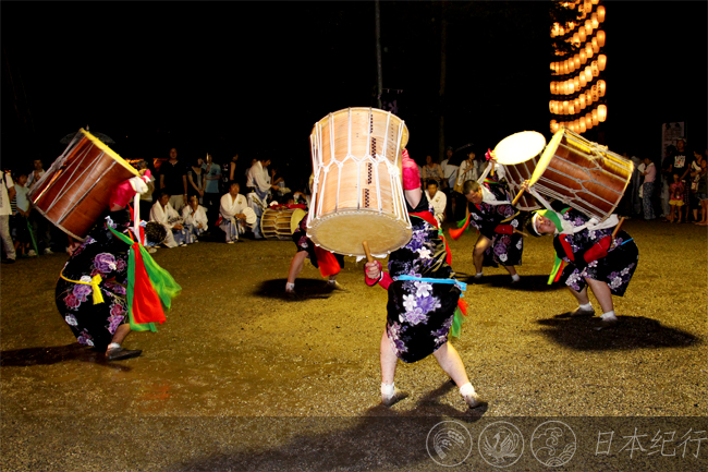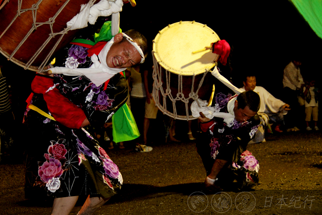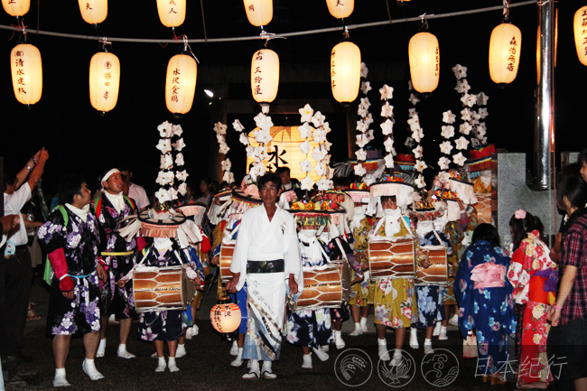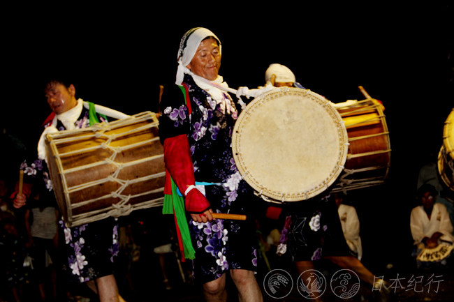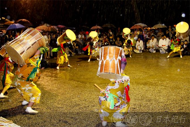 7月31日晚8点,也许是老天听到了水沢人的祈祷,在诹访舞刚开始时便下起了倾盆大雨。这或许不是远道而来的游客们期盼的事情,可对于水沢人来说大雨仿佛是老天的回应。水沢人表现得很镇定,看舞的和跳舞的人竟没有一个慌乱躲避这突如其来的阵雨。哗哗的雨声、悠扬的笛声和富有节奏的鼓声交织在一起,身着不同花布浴衣的十几名少年少女们尽情地挥动着腰鼓。这就是我在四日市水沢村看到的乞雨舞。