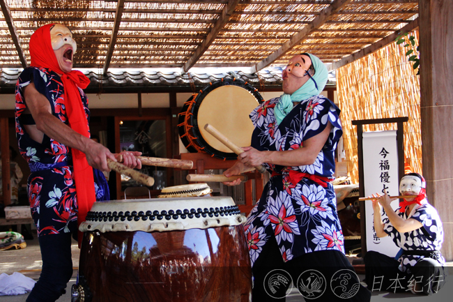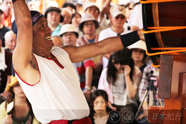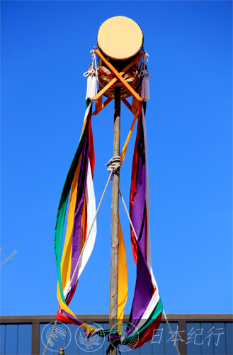 今年9月10日天气格外晴朗,上午我来到了伊势神宫老舖云集的历史街道“托福横丁”。街头火辣辣的太阳下人头攒动,正在犹豫该往哪个方向走时,一阵阵咚咚的鼓声从远处传来,抬头寻声望去,在50米开外的街道中央由妇女和儿童组成的鼓队正朝着这边走来。鼓队一路敲敲打打,在人们的簇拥下为古街增添了一份怀旧的风情。今天,在托福横丁的中心有一个专门的鼓场叫太鼓橹,另外两处是设在五十铃川河岸的舞台。因为太鼓橹的节目比较多,所以我首先去了那里。太鼓橹的场地并不很大,里三层外三层挤满了人。日本人向来很懂礼貌不会你推我搡,即使在人群外围也不会有谁硬挤进来,大家都很有秩序地观赏表演。
