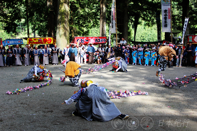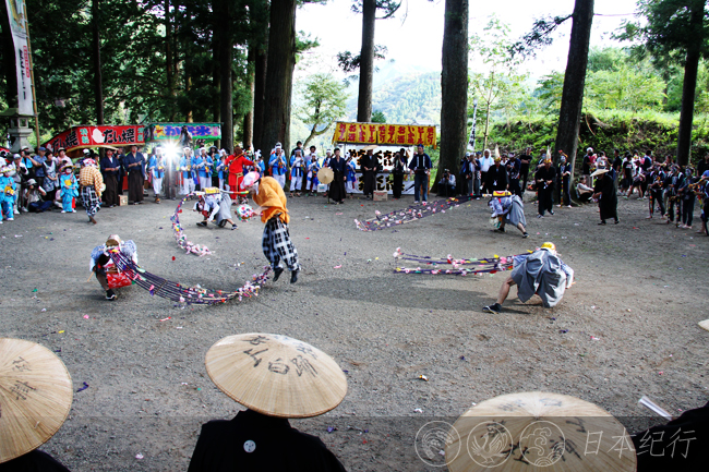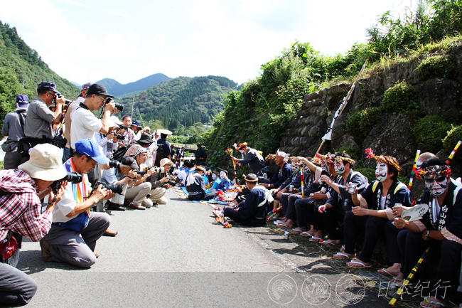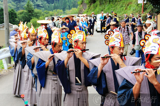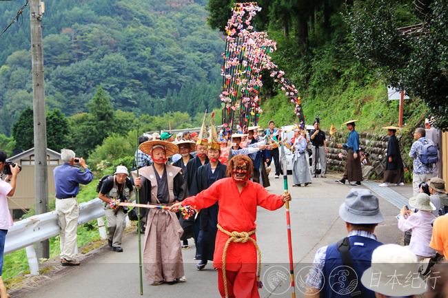 今年9月11日清晨,我从三重县鸟羽市出发,中午时才到达岐阜县郡上市。初秋的郡上市少了几许酷热,沿着山路开车去明宝町寒水村时,遍地的青山和金灿灿的稻穗装点着沿途,稀稀落落的民家静静地坐落在山间,让人感觉这里的生活和自然保持着一种真正的融洽与和谐。当我抵达寒水村时,数百个村民和游客聚集在一起,延续300多年的凤舞(寒水挂踊)就要开始了。