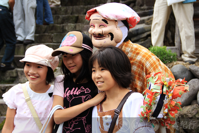 参加凤舞的老老少少共有130多人,并且都是男人。他们奇装异扮,一边唱着山歌一边敲锣打鼓,排成一列行走在山间的小路上。下午一点,舞队涌进当地的土地庙—白山神社。神社里古木参天,观众们早已围挤在四周等待凤舞的开始。首先由赤鬼提斧登场,紧跟着130多名打扮得稀奇古怪的大人和孩子们绕场三周,并围成了巨大的圆形。场子中间是四名年轻的男子,他们的背后悬挂着3.6米长的竹制凤尾,随着古老的歌谣一边敲鼓一边将凤尾摇来摆去。每当舞者的凤尾横扫地面时,两个驼着背的笑面翁就会蹦蹦跳跳的越过朝自己扫来的凤尾,偶尔没躲过去时不是挨打就是被摔得四脚朝天,而一旁的赤鬼和青鬼则顺势拾起散落在地上的花卉,华丽的舞姿和滑稽可爱的动作看得大家饶有兴趣。