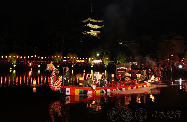 下午6点在采女神社完成了庄严的奉纳礼之后,人们便围在猿沢池边等待最后也是最关键的仪式。随着夜色的降临池塘的灯火散发着朦胧的光亮倒映水中,中秋的圆月藏在云雾里忽隐忽现,而兴福寺五重塔的轮廓在夜里则显得更加清晰。晚上7点,篝火被点燃,猿沢池畔奏响了悠扬的雅乐。这时两艘龙凤舟载着花扇和宫女缓缓地在猿沢池里滑开,龙凤船环绕池塘两周之后将花扇投入水中。人们静静地观赏着华美的船只,我夹杂在人群中一边拍摄龙凤舟与五重塔重叠的画面,一边沉浸在中秋之夜的幽玄之境中。