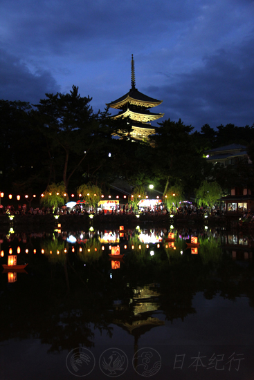9月12日,仲秋。下午5点,我来到奈良看到了故事中的猿沢池和采女神社。猿沢池波光翠如琥珀,一盏盏日本风情的灯船悠悠地浮在水面,池塘边绿柳成荫倒影婆娑,一串串红色的灯笼垂挂在枝头,为原本寂寞的池畔增色不少。远处是兴福寺高大的五重塔,它的倒影直达池心和猿沢池的景色交相辉映,形成一副祥和安宁的庭院美景。