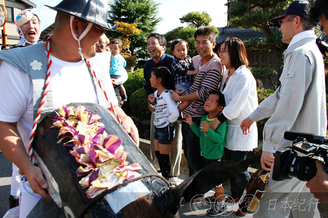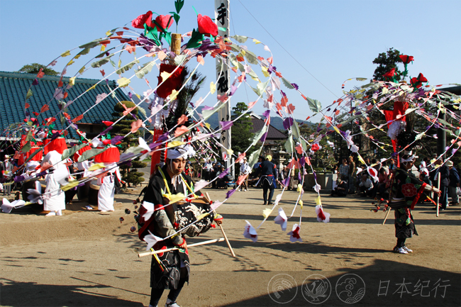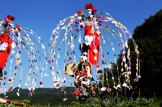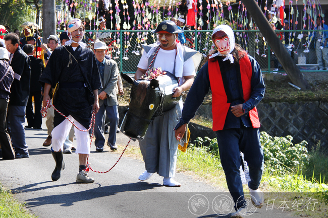 所谓的御旅所只是村中一间很普通的房子,当然在日本它别有含义。这个时侯御旅所的门前已经围着许多大人和孩子,他们一身节日服装。可是在众多人群中最引人注目的还是六名头顶巨大花伞的舞者,他们站成一排,好像六棵盛开的樱花一般在微风中摇曳。透过五彩的花枝可以看见舞者身穿一件牡丹花图案的浴衣,头顶插着孔雀的羽毛,每个人的胸前还挂着一个太鼓。下午1点半,整装待发的舞队在鼓声的伴奏中浩浩荡荡地朝着胜手神社出发了。走在队伍最前面的是引路之猴,其后是两匹专爱作怪的赤、黑马。笛手位于中间,之后是红色盖头的鼓手和开路的鬼,而六名头戴花伞的舞者则走在队伍最后。一路上妇女儿童和摄影者们前呼后拥,他们路过田野、农家,并以青山、碧空为伴,那情景远远望去仿佛画家笔下的画卷般充满着诗情画意。