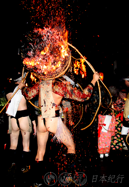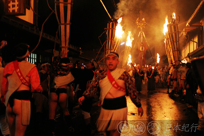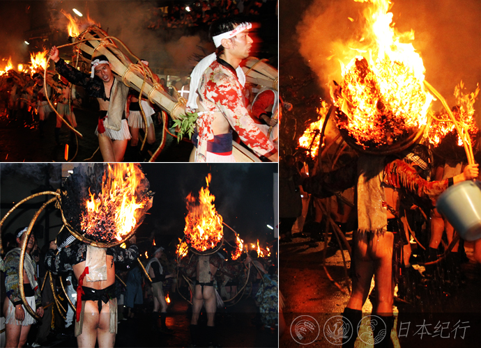 傍晚,鞍马火节在大雨中如期举行。暗夜中家家门前的篝火被点然,街上到处都是点火把和穿着丁字裤袒胸裸背扛火把的男人,越来越多的人拥挤在狭窄的山路两旁。晚上8点左右,光着身子的男人们扛着100公斤重的巨大火把开始高呼“祭礼呀!祭礼!”,并朝着鞍马寺走去。鞍马的街道立刻变得热血沸腾,500多支大大小小的火把在夜空中摇晃,人们仿佛沐浴在火炎当中。快9点时,火把聚集在鞍马寺入口的阶梯处,看着熊熊燃烧火光冲天的壮观场面,观众们克制不住地雀跃欢呼。火炎乱舞中一个不小心就容易受伤,这时人群中有人倒下被担架抬走,是兴奋过度还是烧伤谁都不清楚。鞍马火节达到了高潮。