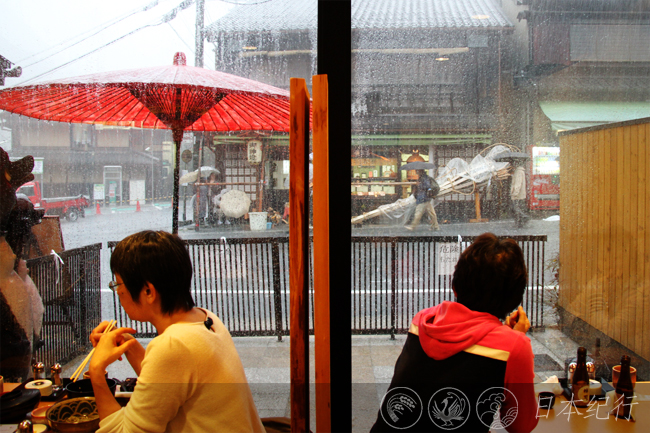 我是早晨从三重县鸟羽市出发的,下午1点多就赶到了目的地。鞍马火节在下午6点举行,我首先来到被青山环绕的鞍马温泉,泡在热气腾腾的露天温泉里放松身心洗去旅途的疲惫。都说山里的天气变幻莫测,不知何时竟下起雨来。出了鞍马温泉我便走进街角一家叫神山的饭馆。此时,雨越下越大,雷鸣电闪中更多的人涌进饭馆。我慢慢地品尝着京的料理,透过橱窗期盼外面的雨能够早点停下来。