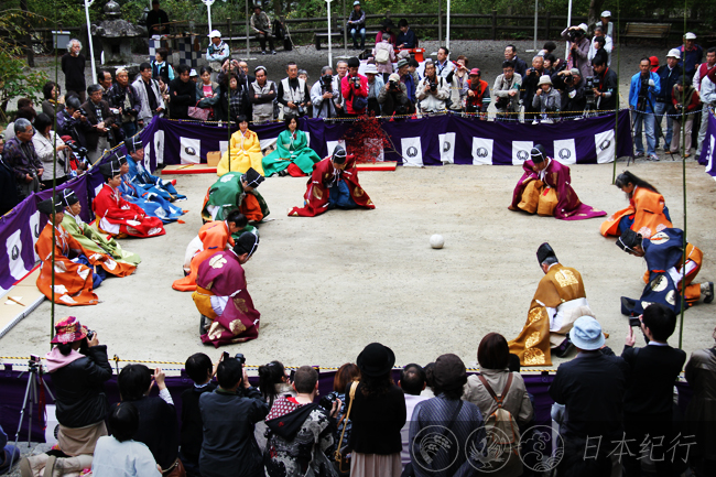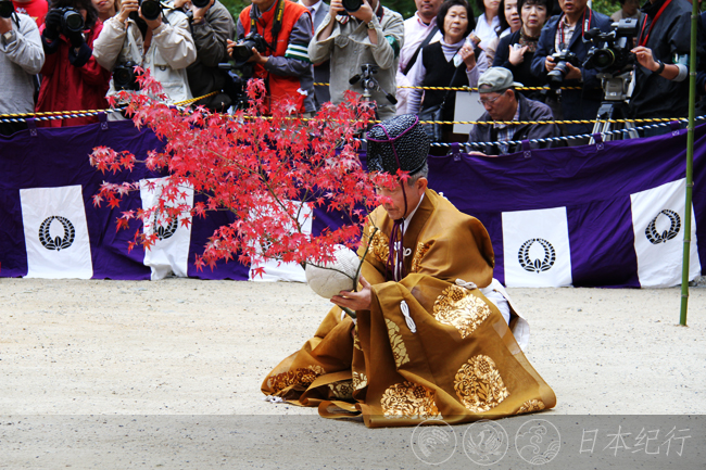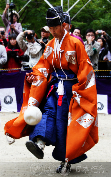 11月3日上午11点,谈山神社的正殿前围起了四方形的场地,历史悠久的蹴鞠节(日本叫蹴鞠祭)正式开始。一行古装打扮的蹴鞠队伍在古典乐曲的伴奏下列队入场。其中一人手持枫叶,蹴鞠就夹在枫叶当中,确切地说是被夹在树枝当中的。蹴鞠由鹿皮做成,微呈椭圆形,看起来很轻,一眼望去的确有点像足球。蹴鞠表演通常由6至8人为一组,尽量不让蹴鞠落地是蹴鞠运动的基本规则。一系列的祭拜礼过后,身穿古装的男女开始在场内表演蹴鞠。看着他们认真传球和接球的动作,我想起了高中和大学时代踢足球的日子,我也是个足球爱好者,用脚、膝盖或头部曾颠球到上百个。可是蹴鞠只能用脚来踢,而且要保持身体的端正优雅,观众们不时地用掌声回应场上精彩的表演。