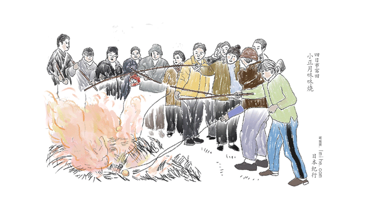 日本小正月的做法多种多样。除了火节之外,有的用米粉在树枝上做饼花摆在屋中祈祷丰年,有的吃小豆糯米粥开通新年的运势,农家会在自己的庭前或地里假装插秧种稻预祝水稻的好收成…。总而言之,日本正月里的习俗多数与农事有关。不仅如此,小正月火节还代表正月的结束和送年神回故里。