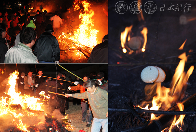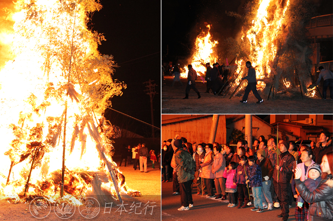 虽然没有什么根据,可是日本人相信竹子燃烧的声音和升腾的火焰是非常神圣的。据说如果被这火烤到可以变得年轻而聪明,燃尽的木炭涂在身上会除邪免灾,百姓们用火烤镜饼(年糕)吃能防止一年不生病…。不仅如此,许多地方还按火柱倒塌的方向来预测一年农作物的吉凶。从中国人的角度看这也许是迷信,可是,对于任何时代任何国度,火本来就是神圣而不可轻视的存在,火可以带给人温暖也能烧毁一切,它的威力是无穷无尽的。