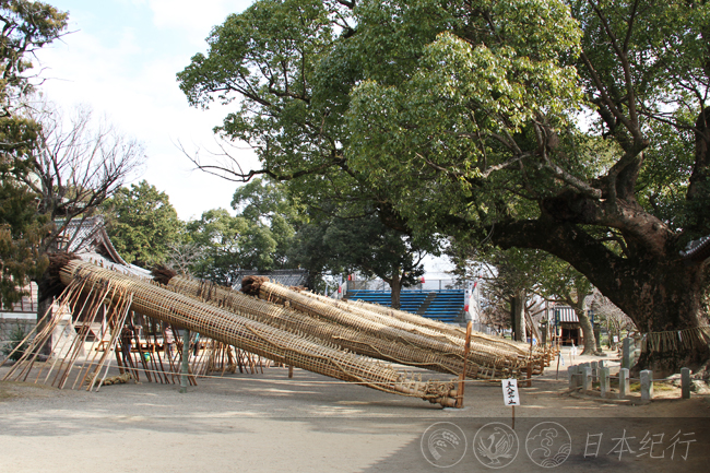 当我到达大善寺玉垂宫时,眼前六个巨型火把横躺在寺院的中心。火把日语叫大松明,鬼夜用的火把由无数根竹子捆扎而成,每根直径1米、长13米、重1.2吨。制作如此巨大的火把绝对不是件易事,当晚这六个庞然大物要烧到11点多。