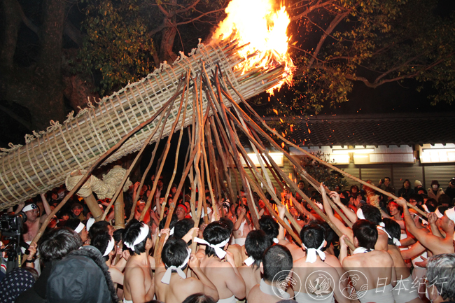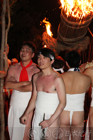 晚上7点刚过,几百名身穿白色丁字短裤的九州男儿冒着寒冷纷纷来到现场,其中还有幼儿参加。大约一个钟头的净身仪式结束后,九州男儿从寺院里取出火种(鬼火),在一片欢呼声中将火把点燃。不到瞬间的功夫大善寺玉垂宫里火炎乱舞,鼓声震天,场面十分壮观。在火把燃烧的过程中舞台前表演了驱魔舞,我挤在人群中,努力地捕捉着精彩的瞬间,可是每挪动一步,何其艰难。10点左右,赤身裸体的九州男儿开始移动火把,在锣鼓交加的呐喊声中他们用木棍将巨大的火把支起并绕着本殿转上两周,以此来驱赶鬼邪、祈愿五谷丰登和国泰民安。