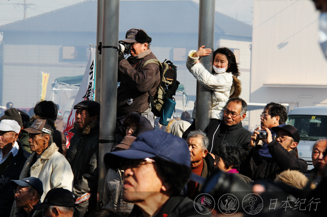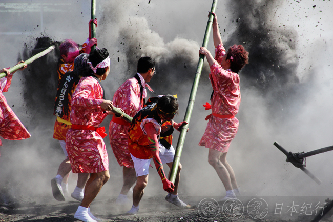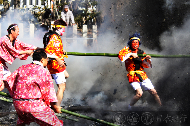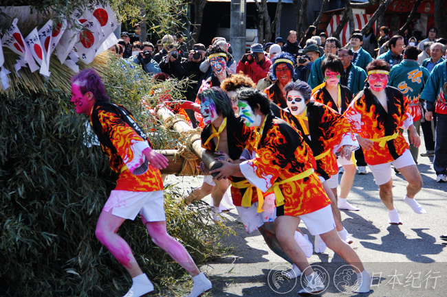 海津市今尾左义长火节从中午开始,当我赶到那里时当地的男人们正忙着将十三个竹轿推向秋叶神社。神社的周边人山人海,正等待着竹轿的入场。今尾左义长仿佛是一场化妆的盛会,各个地区的男人们都奇装异扮。当场内的竹神轿被点燃后,燃烧的竹子不断爆发出“咚!咚!”的响声。在跳动的火光中,那些化了怪妆的男子便开始围绕着火焰拼命地奔跑,场面诙谐幽默。