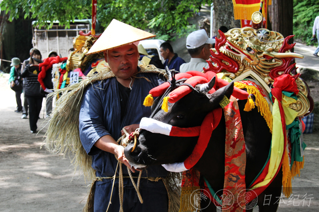 壬生花田植(插秧节)起源于日本江户时代中期,是当地农民敬拜田神,祈求丰收的传统农耕仪式。插秧本是一件重体力劳动,可是当地的人们争相在自家的牛身上装点着各种豪华的饰品(雕刻着各种图案的花鞍和彩色的颈圈),插秧就多了一份文化的色彩。