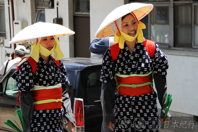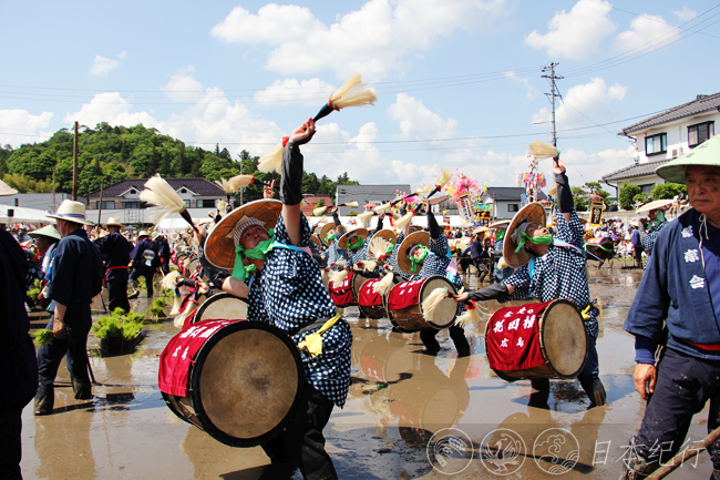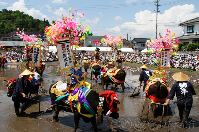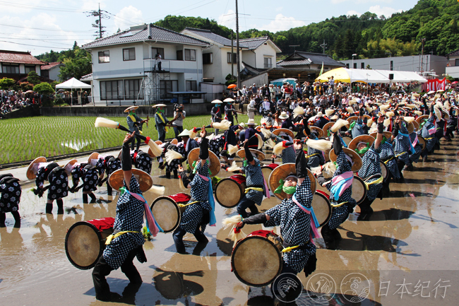 预祝丰收的花笠舞拉开了插秧节的序幕,接着被精心装扮的十四头耕牛排成一例步入水田,在第一头牛的带领下划着各种图案犁田。于此同时,八十多名当地的男女也进入水田,男人敲鼓、吹笛,女人边唱歌、边插秧,那情景仿佛是一张古老的画卷,让观者大饱眼福。