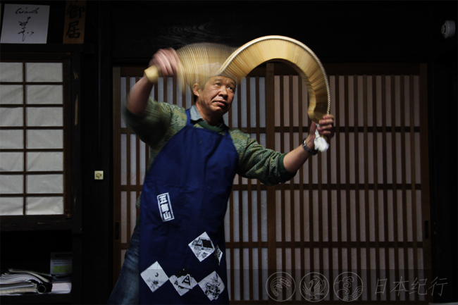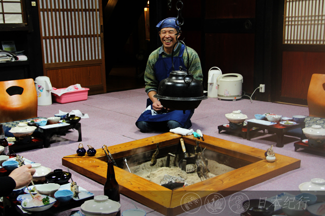 晚上8点多,我是最后一个返回弥次兵衛家的。此时,大家正围坐在合掌造特有的坑炉边准备共进晚餐。炉上烤着红点鲑鱼(日本称其为岩鱼),席间弥漫着鱼香和暖气。我弹落身上的白雪,加入他们之间,不觉中忘记了外面的寒冷和一路的疲惫。老板递过来一碗肉汤,我品了一口,清淡得不知是什么肉作的。一名来自大阪的年轻人尝出了熊肉的味道,原来那是老板从山里捕获来的野味儿。酒宴结束后,老板还特意为大家表演了我在岩濑家没有看到的民谣筑子舞,那看似奇特的半圆形板薽乐器在他的手中挥动自如,仿佛有一种魔力。