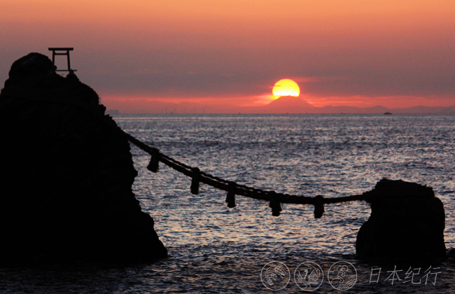 富士山在日本被称为灵峰富士,是日本人心目中的神山。日本人又信仰太阳,而立于海中的夫妇岩正是太阳(伊势神宫的天照大神)信仰的第一道关门,所以每到夏至的时候日本人会在此朝拜日出。由于梅雨季节等各方面的影响,夏至前后的天气很不稳定,夫妇岩、富士山、日出能够形成一线是10年难遇的景象,却也有可能在某个清晨突然出现。