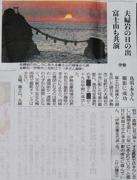 今年6月29日早晨,我和平时一样从鸟羽市沿着海岸线来到伊势市二见浦的夫妇岩。一群摄影者们早在那里支起了三角架,大家盯着漆黑而安静的海面和远处暗红的夜空等待着奇迹的出现。随着时间的推移,天空开始逐渐变亮。大概在4点46分时,太阳在富士山的背后缓缓地升起,并沿着左侧的山缘爬到了富士山的顶端。我摁下快门,记录了这个精彩的瞬间。照片在第二天的日本『中日新闻』上以「夫妇岩的日出和富士山共演」为标题被报道,立刻受到了各方人士的注目。