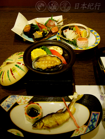 我本可以提前到达芳泉的,只因途中路过日本著名禅宗、曹洞宗的总寺院—永平寺。等我离开了永平寺来到芳泉酒店时天已近黄昏。我放下行李后便匆匆赶往离酒店只有一刻钟距离的福井县名胜“东寻坊”。赶到东寻坊时,刚好看到了美丽的晚霞和日本海的日落。再返回到芳泉时已近8点。酒店的女主人为我准备了丰盛的晚宴和带有露天温泉的高档房间。