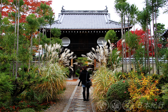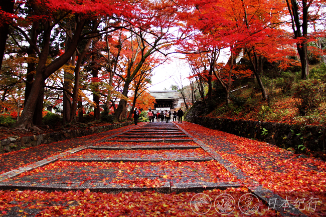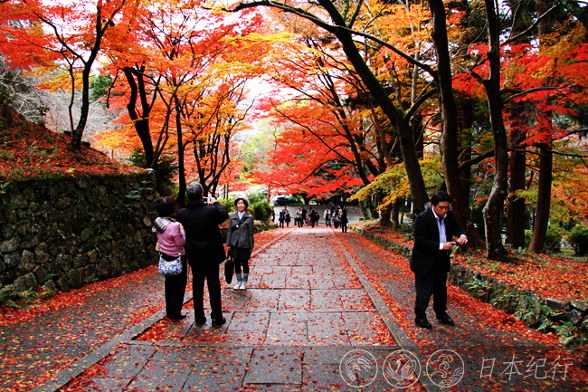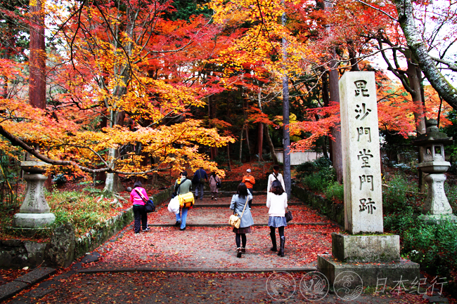 12月3日,京都的天气阴沉,下午还飘了一阵细雨。位于京都市山科区的毘沙门堂是此行的第一站。毘沙门堂建于703年,是天台宗的一所寺院。寺院因祭奠着日本七福神之一的毘沙门天,而得名毘沙门堂。毘沙门堂是春天看樱花和秋天赏枫叶的知名古刹,很多日本人来此祈祷买卖兴隆,合家欢乐。毘沙门堂不是很大,转上一周也不过半个时辰。勒使门前长长的石阶路和两旁的红枫形成的景致是毘沙门堂的最大看点,满地的红叶和如云似火的枝头美得无法用语言形容,清风过处,漫天的红叶飞舞飘零,此情此景使每个人如置身梦境之中。